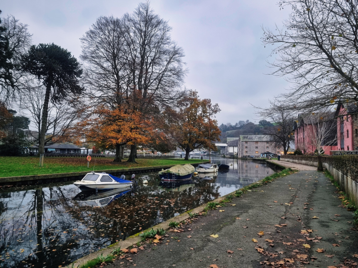 Vire Island is named after the French town that Totnes is twinned with. It stretches south from the bridge and, to its west side, it looks almost like a canal – home to a few boats and lovely waterside properties. To its east side, the wider river flows. The island mass comprises trees and parkland for a stroll, with benches to sit and enjoy the river.