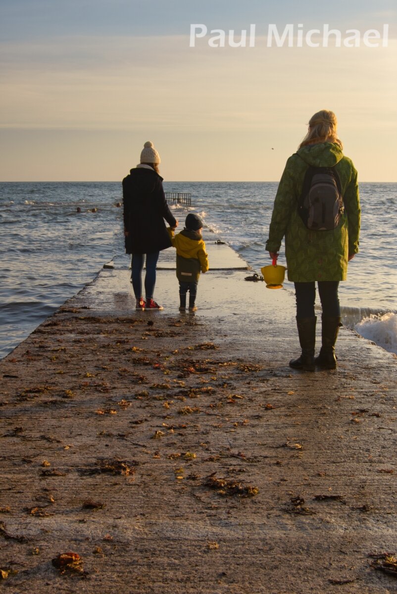 After an hour or so of play, including a plot or two of sandcastle developments, we decided to take a stroll. We put the kite, buckets and spades away and took a stroll along the beach. There’s a walled-off area at Millendreath that looks a bit like a sea pool. Some swimmers had braved the cooler weather just off of the shore, as we walked out along the wall.