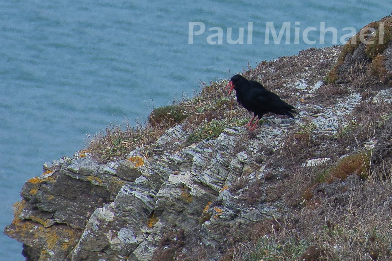 There is a rocky outcrop at this point and, as I was hanging around for cows to move, I saw some black crow-looking birds flying around. They flew and acted a little differently, though. So, off I went to inspect. I was delighted to get my first close-up sighting of Cornish Choughs.