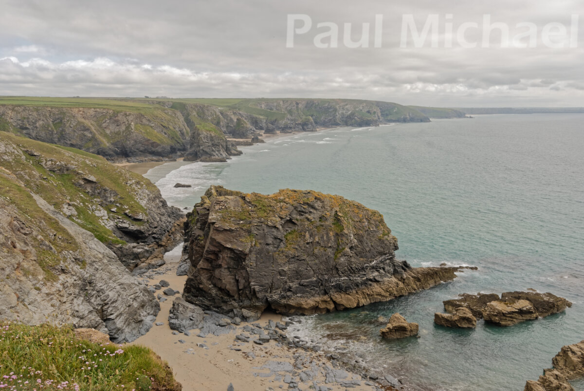 I mentioned the island-like rocks that stand alone in the seas and then in the sand when the tide goes out. They have names: the northernmost rock is known as Diggory’s Island. Moving south there is Queen Bess Rock, Samaritan Island, Bedruthan Steps, Redcove Island, Pendarves Island and Carnewas Island being due west of the NT Car Park.